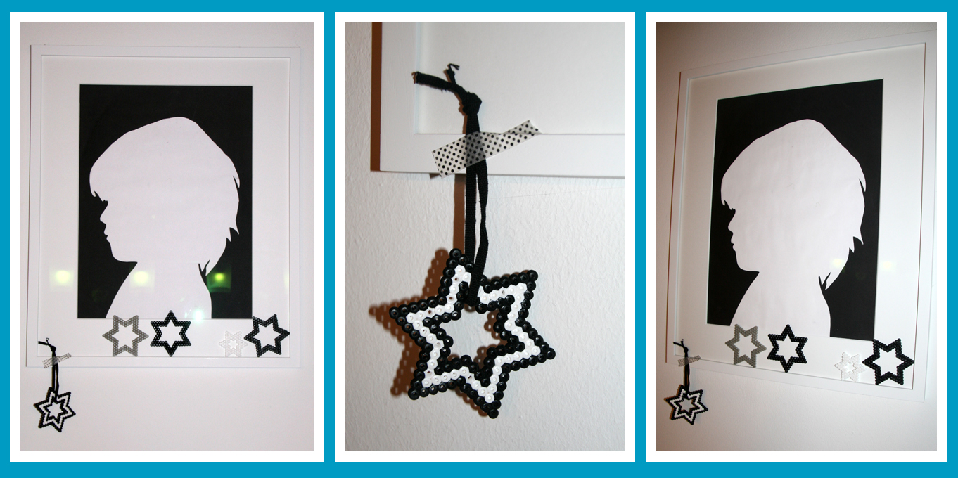 Im Moment mag ich Deko aus Bügelperlen. Passend zum Motto zeige ich hier Sterne in Schwarz, Schwarz-Weiß und in Grau. Zeitlos, schlicht und schön. Ich mag sie sehr. Wie auch den Scherenschnitt aus Juniors Kindergartentagen. Hach. ♥