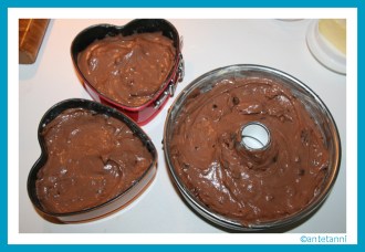 Hmmm, lecker, ein Schokoladenkuchen. Mit Schokostückchen innen drin. Yammieh. Und weil dieser als kleine Kleinigkeit und Beigabe zu einem Geburtstagsgeschenk sein sollte, habe ich den Teig aufgeteilt in zwei Herzförmchen und eine kleine Springform mit Wellenboden.