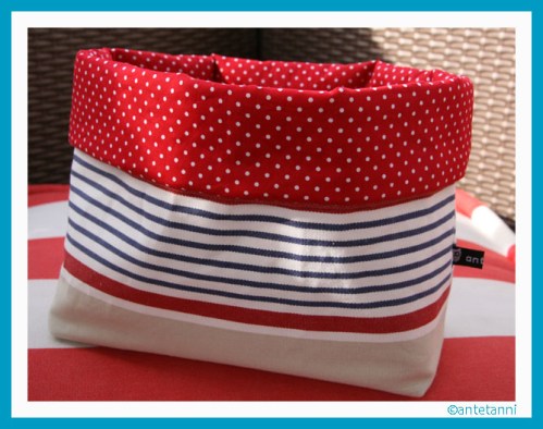 Entstanden ist dieses in Blau-Weiß-Natur-Rot gehaltene Utensilo mit gepunktetem Innenfutter.