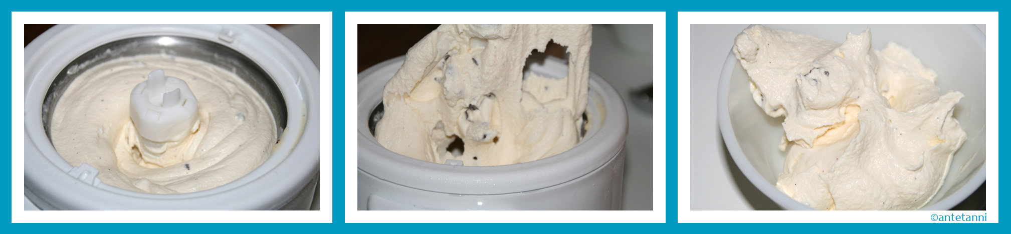 - Nach der Abkühl-/Ruhezeit Masse mit dem Stabmixer aufschlagen, danach in die Eismaschine geben und cremig fest frieren/rühren lassen (20 – 30 Minuten)