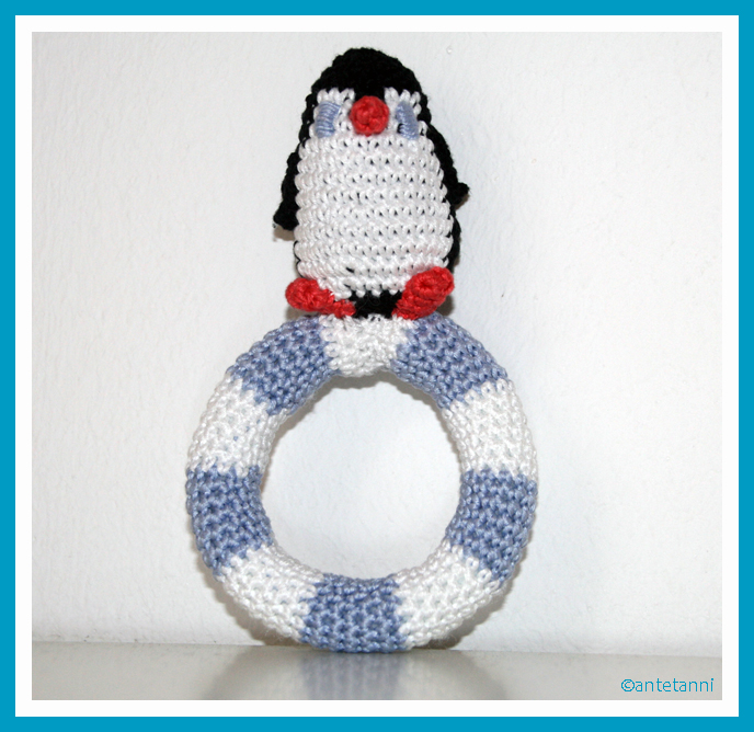 Das trifft es nicht ganz. Vielmehr lasse ich jetzt häkeln :-)… Anke, eine liebe Nähkurskollegin, häkelt traumschöne Sachen. Unter anderem entzückende Babyrasseln aus Baumwollgarn, verziert mit kleinen Figürchen – hier der kleine Pinguin, es gibt aber auch viele weitere zauberhafte Motive, wie z. B. ein Würmchen, das neckisch aus einem Apfel raus schaut, Schmetterlinge, Fische mit einem Blobb-Mäulchen, Blümchen, Matroschka-Püppchen, kleine Häschen…In den Figuren steckt eine Plastikkugel/Rassel.