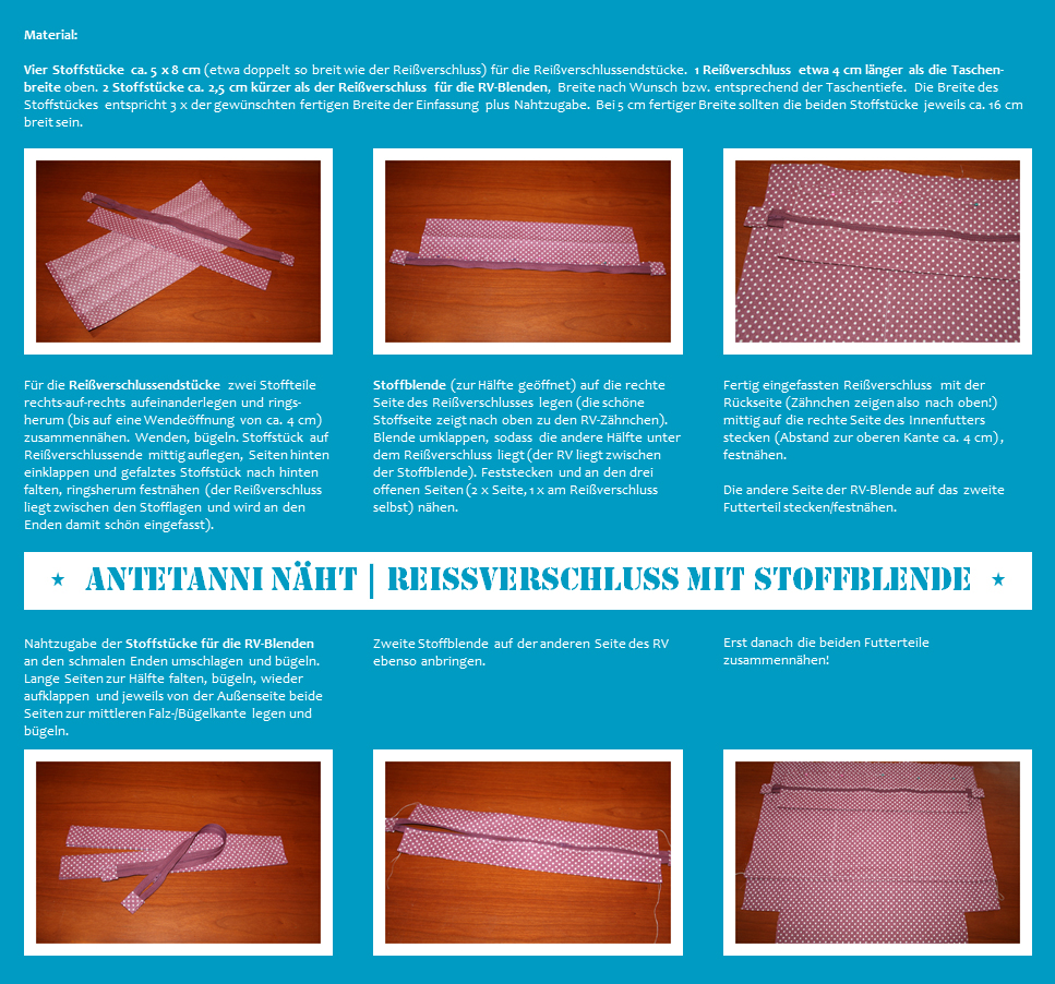 Deine Fotos sind leider zu klein geraten. Selbst, wenn ich die Bilder in einem weiteren Fenster öffne und sie vergrößere, sind sie zu klein, um Genaueres zu erkennen. Der erste Verbesserungsschritt wäre hier, die Fotos zu vergrößern. Bei den Reißverschlussendstücken ist leider überhaupt kein Bild vorhanden, das zeigt, wie du vorgehst. Vor „wenden, bügeln“ wäre es gut, die Nahtzugabe an den Ecken schräg abzuschneiden, damit das Reißverschlussendstück ordentlich wird. Ab „wenden, bügeln“ kann es für einen Laien ganz schön verwirrend werden. Bedenke immer folgendes – was für dich klar ist, hinterlässt bei einem Anderen evtl. offene Fragen. Bilder die deine Arbeitsgänge zeigen, sind eine große Hilfe! Bei den Reißverschlussblenden gibst du als Maß die dreifache Stoffbreite, der gewünschten Blendenbreite plus Nahtzugabe an. Wenn meine Blende am Ende 5 cm betragen soll, mein Stoffstück 16 cm breit ist, ich die Blende so einbügle, wie es auf deinem Bild zu sehen ist (erst zur Hälfte falten, bügeln, anschließend das Stoffstück öffnen und die die beiden Seiten jeweils zum eingebügelten Falz legen, die neu entstandenen Kanten bügeln, die beiden Kanten aufeinander legen und nochmal bügeln), bleiben mir am Ende 4 cm übrig. Richtig wäre also, die vierfache Breite der gewünschten Blendenbreite (und das nur bei einem dünnen Stoff, andernfalls reicht die zweifache Breite, der gewünschten Blendenbreite plus Nahtzugabe an den langen Seiten, die nach innen gebügelt werden muss). Wenn du ein Bildbearbeitungsprogramm hast, wäre es wunderbar, die Nahtlinien einzuzeichnen. Andernfalls gibt es die Möglichkeit, ein unifarbenes Stoffstück zu wählen und dazu einen Kontrastfaden zu verwenden. Noch ein Tipp: Wenn du den Reißverschluss fest nähst, ist es enorm wichtig, diesen wirklich straff zu halten. Ansonsten hat man am Ende unschöne Wellen. Nun wird es nochmal verwirrend: „Fertig eingefassten Reißverschluß mit der Rückseite (Zähnchen zeigen also nach oben!) mittig auf die rechte Seite des Innenfutters stecken.“ Einfacher wäre es zu erklären, was die rechte und was die linke Stoffseite überhaupt ist. Rechts ist also die schöne Seite, links die unschöne bzw. die Seite, die man am Ende nicht sieht. Fertig eingefassten RV mit der linken Seite auf die rechte Seite des Nähguts (in diesem Fall das Innenfutter) legen. Kurz gefasst – links auf rechts.
