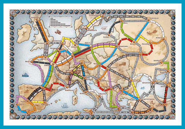 Zug um Zug Europa. Hier werden die Spieler (ab 2 Personen) von den schroffen Hügeln bei Edinburgh zur sonnenüberfluteten Hafenanlage von Konstantinopel, von den staubigen Gassen Pamplonas zu einem zugigen Bahnhof in Berlin oder bis ans Schwarze Meer entführt.