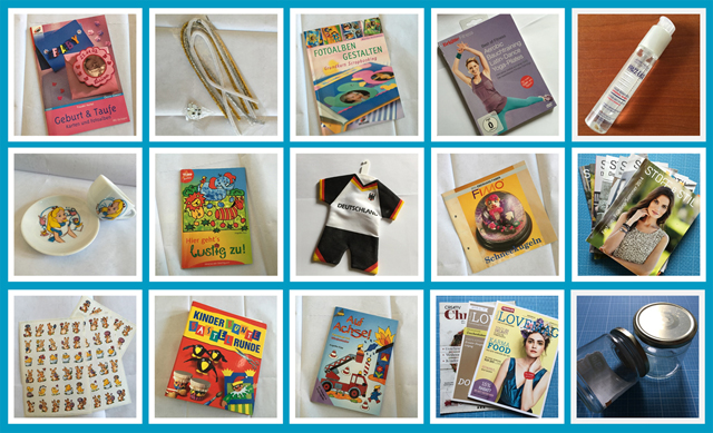 Diverse Bastelbücher kamen ins öffentliche Bücherregal im Gemeindezentrum, ein Stapel Zeitschriften und Kataloge landete im Papiermüll. Die Porzellantasse, das Deutschland-Mini-Trikot und die Häschen-Sticker wurden weitergegeben, entsorgt wurden ein Haarserum, das die Haare kletschig macht, sowie diverse leere Gläser, die ich zum Basteln aufbewahrt hatte. Ich habe im Moment keine Zeit dazu bzw. möchte meine Zeit für anderes nutzen und Gläser von Marmelade & Co. sammeln sich ja regelmäßig wieder an.