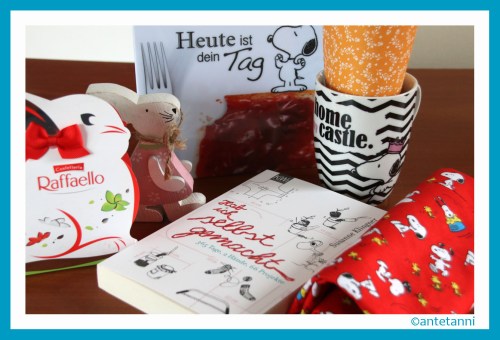 Liebe Jasmin, du hast meinen Geschmack voll und ganz getroffen. Ich liebe Snoopy und die Peanuts und so freue ich mich riesig, dass ich mein Frühstückstoast ab sofort auf dem witzigen Frühstücksbrettchen serviert bekomme und mein Kaffee schmeckt aus der Snoopy-Tasse bestimmt noch mal so gut. Den Stoff mit Snoopy finde ich genauso dufte, ich habe hier noch ein weiteres feines Snoopy-Stöffchen liegen, das ich vor längerem einfach so mal von * Katrin | nealichundderdickeopa * geschenkt bekommen habe (♥) und jetzt wird es allerhöchste Zeit, endlich auch mal wieder etwas für mich zu nähen… Ich werde berichten. ♥ Raffaello… was soll ich sagen… Die muss ich verteiden, denn der Junior liebt die auch und stibitzt sie mir dann und wann. Auf das Buch Hab ich selbst gemacht von Susanne Klingner bin ich gespannt, der Klappentext lässt ja einiges vermuten. Und der Holzhase steht schon auf dem Sideboard und leistet dort dem kleinen Porzellan-Häschen Gesellschaft. Vielen lieben Dank für alles.