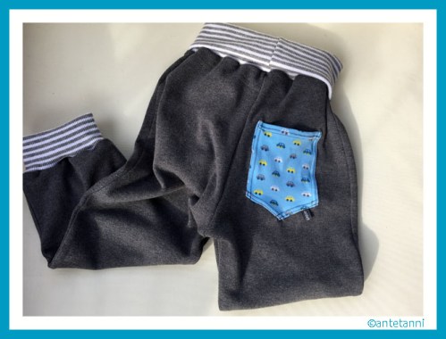 Hose 4 von 5 nun ist ebenfalls ein Recyclingwerk. Genäht aus einer dem Schüler lange zu klein gewordenen Jogginghose aus Sommersweat. Aufgepeppt mit einer Gesäßstasche aus einem Reststück des hellblauen Stoffes mit den kleinen Autos drauf, aus dem ich Anfang des Jahres den Raglansweater mit Stehkragen genäht hatte. Vorne schlicht komplett in Grau. Dazu ein geringelter Bündchenstoff an Bauch und Beinen. Fertig.