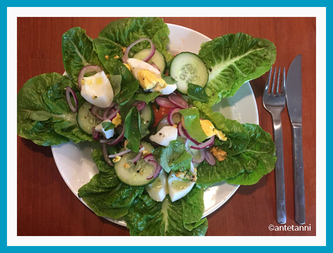 5_Genuss | Es gab viele leckere Dinge in dieser Woche. Von einem leckeren Salat (quasi einen Salat nicoise, jedoch in abgespeckter Form mit den Sachen, die im Kühlschrank waren – dazu gab es noch selbst gemachte Grünkernbratlinge, die mega-lecker waren) über die immer wieder köstliche Kichererbsencreme, Tomaten und Mozzarella mit Oliven, zum Trinken einen leckeren Rosé-Wein wie auch einen Sanbitter… Es mangelte uns an nichts. 🙂