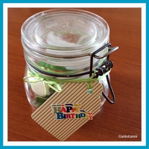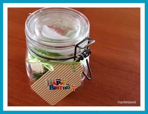 Ich habe die Geldscheine gefaltet und in den Mini-Umschlag gesteckt und diesen wiederum ins Glas gestellt. Die Quaxi-Fröschli, die ich gestern Abend nach der kleinen Wanderung noch schnell im Supermarkt gekauft habe, in Glas gekippt (darum ist das Geld im Umschlag, ich wollte es nicht zwischen die Süßigkeiten legen, dann mag man diese ja nicht mehr essen), Deckel zu, Kordel samt Geschenkanhänger dran. Fertig.