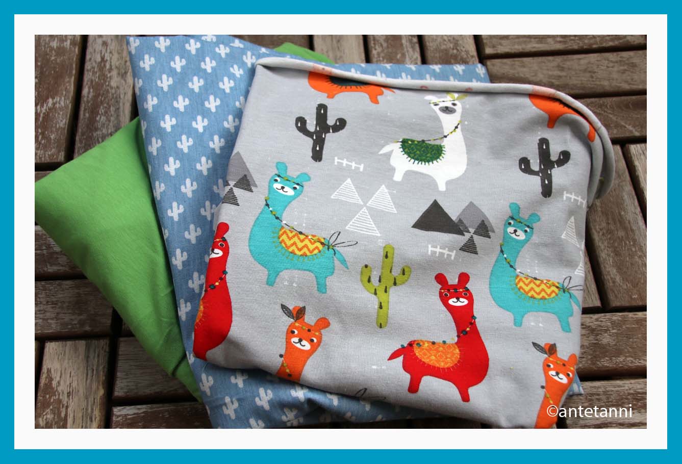 • einen gemusterten Baumwoll-Jerseystoff in Hellgrau mit bunten Lamas