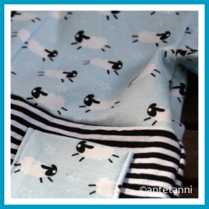 Nun, das kommt davon, wenn man (also ich) nebenbei die Königshochzeit im TV anguckt. Also nicht wirklich die Königshochzeit, aber eben die von Harry & Meaghan. Da war ich mit den Augen wohl mehr bei der schönen Braut als auf dem Stoff und so kam es, dass ich beim Stecken mit Entsetzen festgestellt habe, dass die Schäfchen alle Kopf stehen. Vielmehr gestanden wären. Das wollte ich nämlich nicht so lassen, also noch mal von vorne. Fast. Denn leider waren von diesem niedlichen Jerseystoff nur noch 50 cm im Fundus und das reichte nicht für einen komplett neuen Zuschnitt. So musste ein Ringeljersey als Ergänzung herhalten. Bei rechtem Licht betrachtet, gefällt mir die zweigeteilte Lösung aber nun sehr gut, vielleicht hätte ein kompletter Schäfchen-Anzug fast zu sehr nach Schlafanzug ausgesehen…