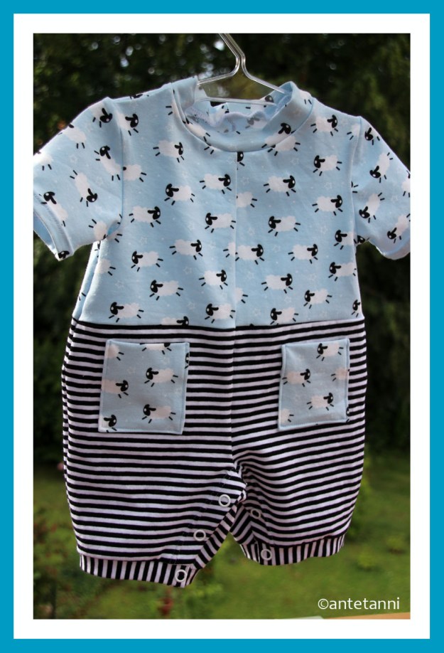 Für die warmen Sommertage habe ich einen Spieler für das Geschwisterkind genäht. Ein kleiner Strampelanzug aus weichem Jersey in Hellblau mit unzähligen kleinen Schäfchen und Sternen.