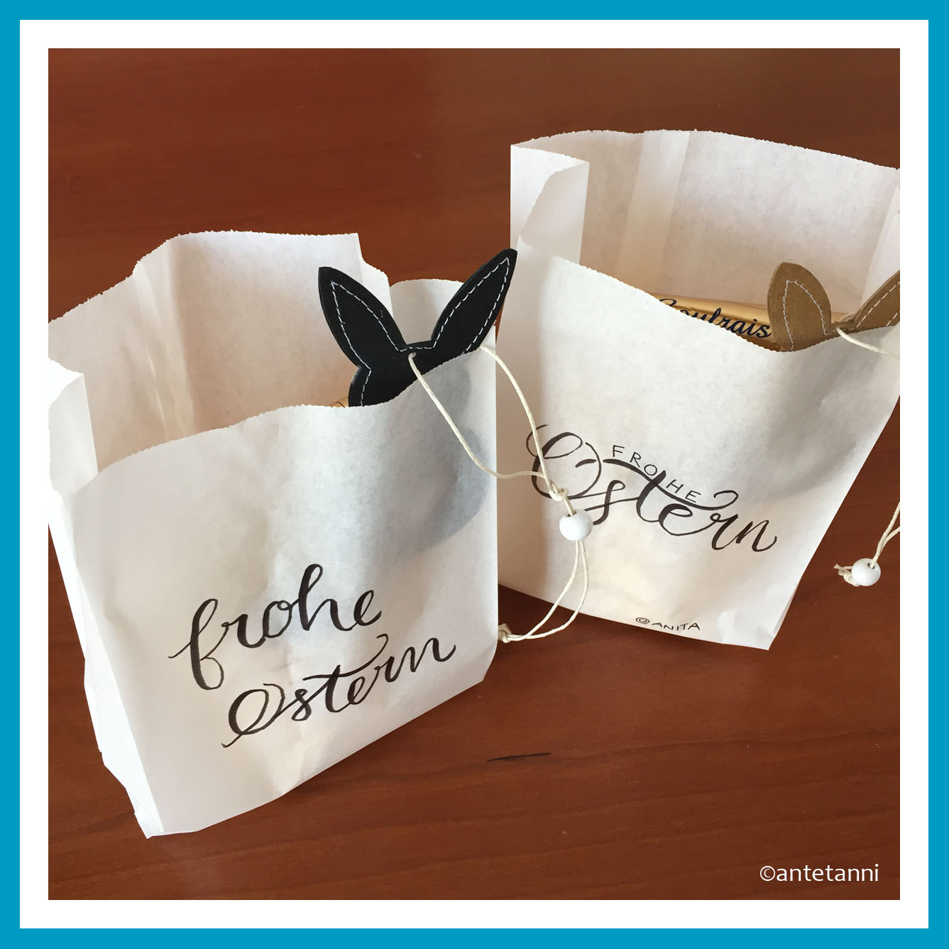Jedes Häschen/Ei steckt in einer kleinen Tüte, auf die ich „Frohe Ostern“ gelettert habe. Das Handlettering ist eines meiner neuen bzw. wiederentdeckten Hobbys, nachdem ich vor Jaaaaaaaaahren mal einen Kalligraphie-Kurs belegt hatte. Es macht Spaß zu sehen, wie unterschiedlich Schrift wirken kann, auch wenn meine Handlettering-Künste wirklich noch in den Kinderschuhen stecken.