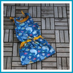 Hier und heute geht’s um einen sommerlichen Overall in Größe 98/104, den ich aus einem blauen Jersey mit Fischen, Schildkröten, Walen und eben den gelben U-Booten genäht habe. Das Oberteil ist doppelt gearbeitet, so schlabbern keine Belege innen rum. Für die Innenseite und die Taschenbeutel habe ich einen sonnengelben Jersey verwendet, der auch schon bei diversen Nähwerken für das Geschwisterkind zum Einsatz kam. Die Farbe gefiel mir beim Einkaufen seinerzeit schon so gut, dass ich gleiche jede Menge Meter eingepackt hatte (nein, Spaß, ich glaube, es war tatsächlich nur ein Meter, aber für die kleinen Sachen braucht man ja auch nicht so viel). Frag mich aber nicht, wo ich den Stoff gekauft habe, ich weiß es nicht mehr.