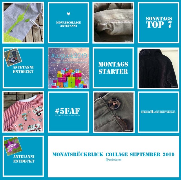 Zu nähen und zu zeigen gäbe es auch noch so einiges… Es liegen hier so viele Ideen rum. Aber gut, dafür bleibt ja noch der Oktober, der morgen jungfräulich startet… 🙂 Heute sage ich erst einmal: Tschüss, September, und danke, liebe Birgitt für die neue Runde Monatscollage!