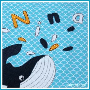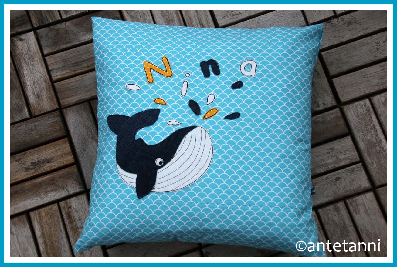 Und so nun auch beim Kissenbezug mit Applikation. Unlängst erst habe ich einen solches Kissen zur Taufe genäht und dabei kam mir die Idee zu zwei Weihnachtsgeschenken, die ich noch nähen könnte. Gesagt. Und am Wochenende getan. Aber da es sich um Geschenke handelt, kann ich das erste Kissen erst heute zeigen…Genäht für das Nichten-Tochterkind – passend zum Baumwollstoff mit Wellen in Türkis und Weiß habe ich einen Wal appliziert (der auch perfekt zum Wal-Sitzsack passt, den ich letztes Jahr fürs Nichten-Tochterkind genäht hatte…). Das Motiv stammt von Franziska | von Lange Hand. Der Wal ist aus einem Jeansrest entstanden, beim Applizieren der Buchstaben und Wassertropfen habe ich mich an den Stoffresten orientiert, die hier schon lagen und von anderen Applikationen, wie beispielsweise diversen Wäschesäckchen, bereits mit Vliesofix bebügelt und übrig waren. Verschlossen wird das Kissen praktischerweise mit einem Hotelverschluss.