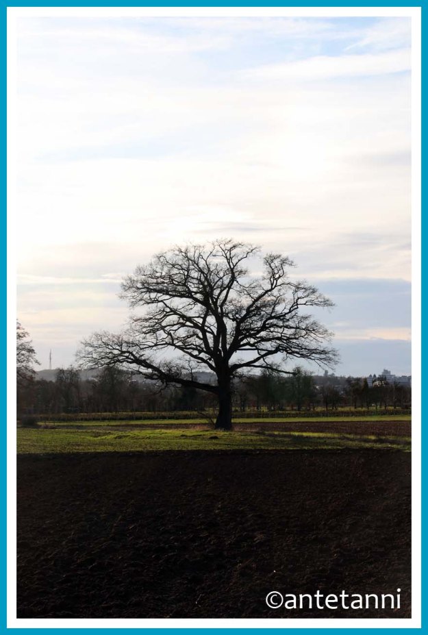 Wie auch immer, irgendwas ist also immer und so haben wir heute den sonnigen Nachmittag genutzt, um eine Runde über die Felder, vorbei am Baum der Bäume zu drehen. Nach einer ersten Sichtung der Fotos zuhause musste ich gleich noch einmal raus zum Fotografieren. Beim ersten Versuch hatte ich plötzlich viel mehr von den Häusern rechts hinter dem Baum im Bild. Ich übe noch in Sachen richtiger Standpunkt und so. Gegen 17 Uhr – was für eine Freude, dass es da noch hell ist! ♥ – stand der Baum etwas im sonnigen Gegenlicht und präsentierte sich so…