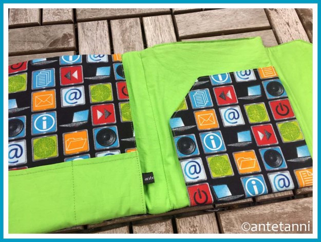Booaah !!!! Diese Hülle ist ja wirklich toll geworden, liebe Anni! Der Symbolstoff ist ideal dafür und die Kombi mit Jeans und grün… großartig!!! Den Bund derart weiterzuverwenden ist ebenfalls eine tolle Idee, wirklich rundum gelungen! Ich bin auf Martins Reaktion gespannt….