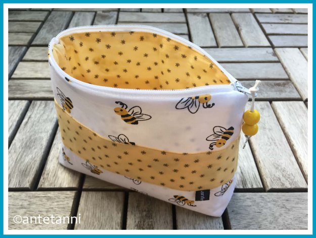 Dieser hübsche Stoff schreit ja danach, vernäht zu werden. So ein Täschchen ist ja perfekt. Die Bienen im Gesicht werden bestimmt unterschiedliche Reaktionen hervorrufen 😉 (Vorsicht!!) Aber am Ende wird das freundliche Schmunzeln siegen!