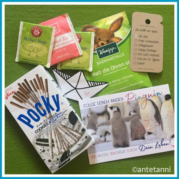 Dank der schönen Karte, die ich von Christine Anfang der Woche aus München bekam, ist mir der im Entwurfsordner schlummernde Beitrag zu ihrem wunderbaren Päckchen im April wieder unter die Finger gekommen, weil ich irgendwo im Hinterkopf hatte, dass da doch noch was war… Zack, raus aus dem Schattendasein und rein in meinen kunterbunten Oktober. Getreu dem Motto: Lieber spät als nie. Ähem. 😉