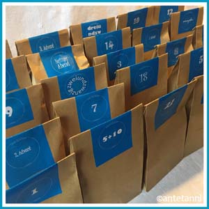 Jetzt will ich aber doch auch noch kurz auf den Kalender zu sprechen kommen, den ich für Anja gewerkelt habe bzw. dich an meinen Ideen für sie teilhaben lassen. Für den Adventskalender als solches habe ich auf Altbewährtes zurückgegriffen und wie schon beim Adventskalenderwichteln vor ein paar Jahren wieder naturfarbene Bodenbeutel verwendet. Auch die Adventskalenderzahlen kommen dir vielleicht bekannt vor. Sie sind ein Mix aus eben jenen Zahlen vom Adventskalenderwichteln und der bunten Neuauflage der Adventskalenderzahlen, die ich vor ein paar Tagen hier im Blog gezeigt habe. Ich habe die Zahlen auf Adressetiketten gedruckt, die ich im Fundus hatte (sie sind beim Ausdruck/Aufkleben teilweise ein bisschen „windschief“ geworden, aber nun denn, da will ich doch mal fünf gerade sein lassen), und die den Vorteil boten, dass sie als Beschriftung und Verschluss gleichermaßen dienten, da sie so groß sind, dass ich sie über die gefaltete Öffnung der Papiertüten kleben konnte.