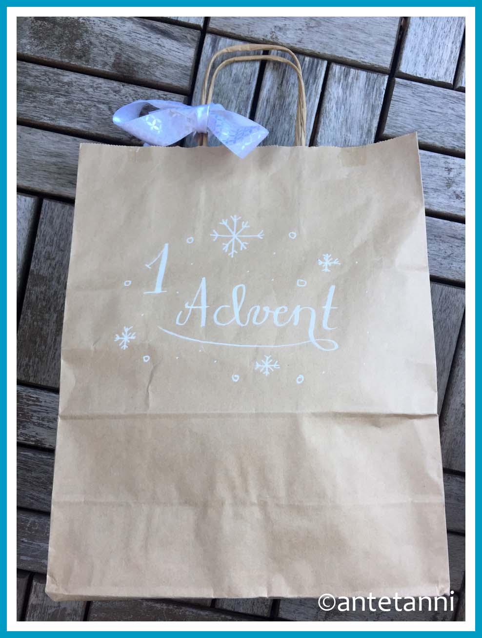 Dafür habe ich aus einem DIN-A4-Papier einen Bodenbeutel gefaltet und bemalt und ein Teelicht samt Kerzenglas (aus einem recycelten Konservenglas) hineingestellt (für das Foto habe ich natürlich draußen gelassen). An der Papiertüte baumelt ein kleiner Anhänger mit einer römischen Zahl I für den 1. Advent.
