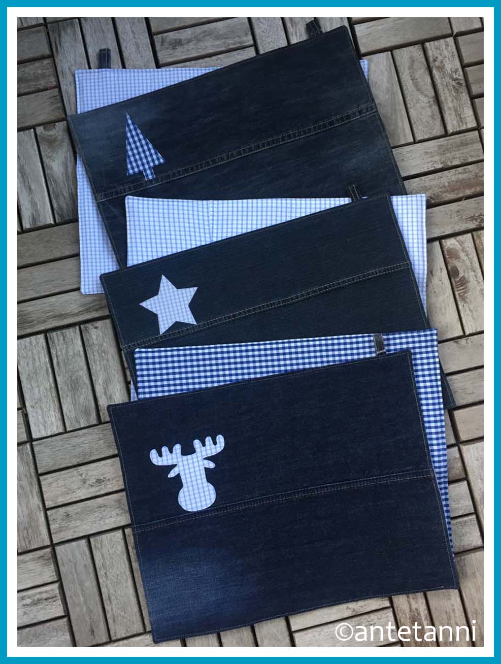 Vielleicht erinnerst du dich an das Tischset Hase aus dem Frühjahr, als ich zwei Platzmatten für Martin genäht hatte. Ganz ähnlich sind nun 3 x 2 Platzmatten entstanden. Wieder aus Hosenbeinen, die beim Nähen von Ofenhandschuhe aus Jeans übrig blieben.