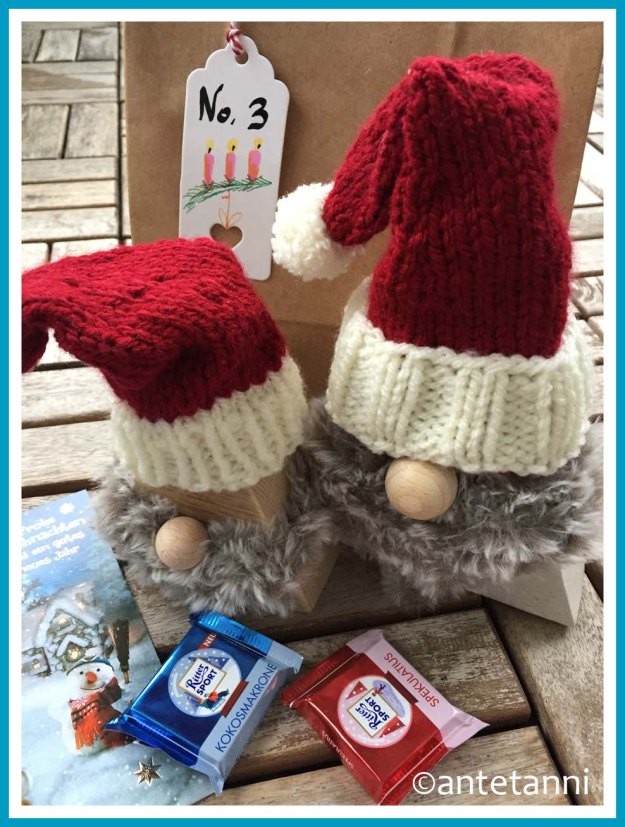 Ausgepackt habe ich zwei knuffige Trolle aus Holz, die Ulrike für uns alle gezimmert bzw. gesägt hat. Alleine dafür zolle ich ihr schon meinen ganzen Respekt, ich hätte ja eine Heidenangst vor einer Kreissäge. Mützen und Bärte sind selbstgestrickt. Wahnsinn. Wunderschön. Ich bin entzückt. ♥
