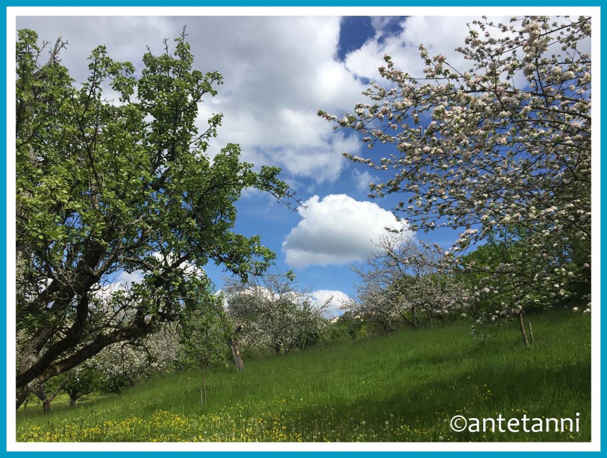 Ist das nicht ein toller Anblick? Die Wiesen in Saft und Kraft und dazu die blühenden Obstbäume? Hach, ich bin ganz verzückt, es war eine so schöne Runde, die über 10.000 Schritte und damit knapp über 7 Kilometer auf den Zähler brachte…
