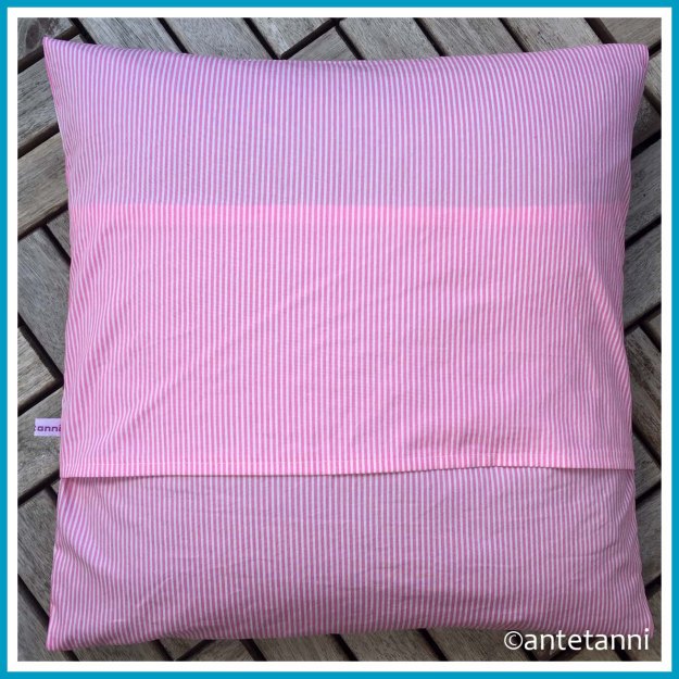 Das es sich um ein kleines Mädchen handelt, habe ich das Kissen wieder aus einem gestreiften Baumwollstoff in Rosa und Weiß genäht.