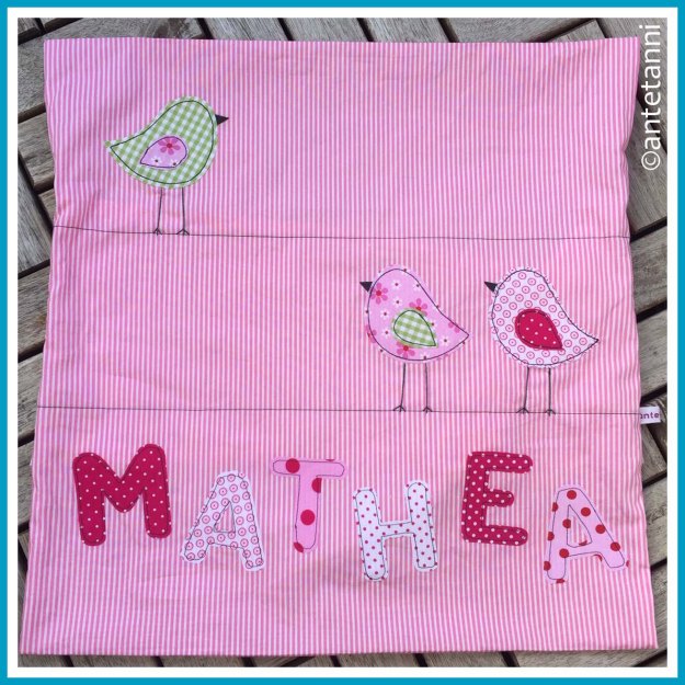 Ich freue mich, dass ich mit meinem Nähwerk meiner Freundin eine Freude machen konnte und ich wünsche der kleinen Mathea alles Gute auf ihrem Lebensweg und viele kuschelige Schmusestunden mit dem Kissen. ♥