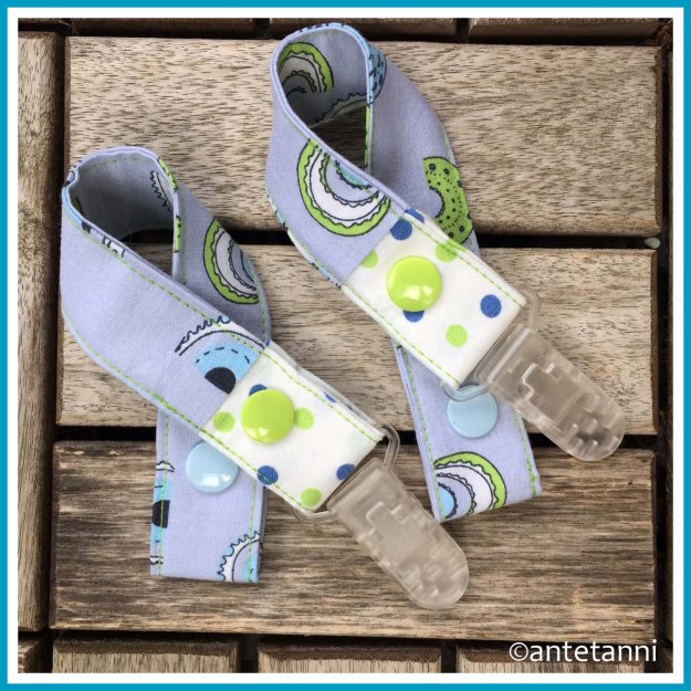 Nein, der Aufwand ist nicht groß, das mache ich doch gerne. ♥ Ich freue mich, dass ich im Fundus passende Stoffstreifen hatte, aus denen ich nun nach dem Schnullerband vom Frühjahr nochmals zwei Bänder mit Hosenträgerclips für Baby L. genäht habe.