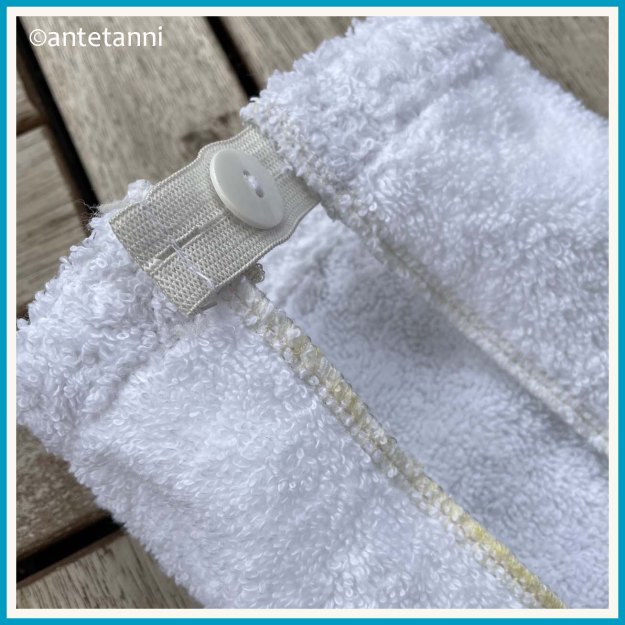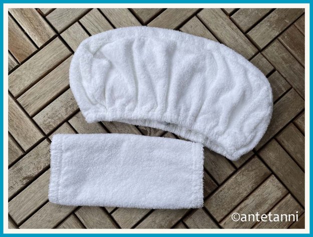 Die kleinen Tücher sind sehr praktisch, schnell abzunehmen und zu waschen, wie mir meine Kosmetikerin schon bestätigte. Hygiene ist ja das A und O bei der Kosmetik. Auf der Frottierware (Bild unten) ist noch die gelbe Schneiderkreide zu sehen, die nach der nächsten Wäsche dann aber weg ist.