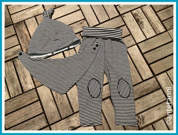 Für Baby L. habe ich vorletztes Wochenende schon zwei Mützen genäht, da der Bub, inzwischen acht Monate, dringend Nachschub benötigte. Nachdem ich schon einmal am Zuschneiden war, habe ich aus dem schwarz-weißen Ringeljersey, den ich für eine Seite der Wendemützen verwendet hatte, gleich auch noch eine Leggings mit Patches in Größe 74 vorbereitet, denn auch Hosen wurden und werden gebraucht.