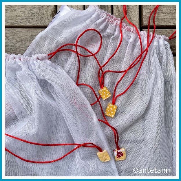 So geschehen bei diesen beiden Frischebeutel, deren glatte Satinbändel nach jeder Wäsche ausgefädelt waren und die ich in der Waschmaschine suchen musste. Und das, obwohl ich schon Knoten reingeknotet hatte. Die Bändchen an den selbst genähten Obst- und Gemüsebeuteln sind da wohl etwas dankbarer oder eben nicht so glatt und flutschig.