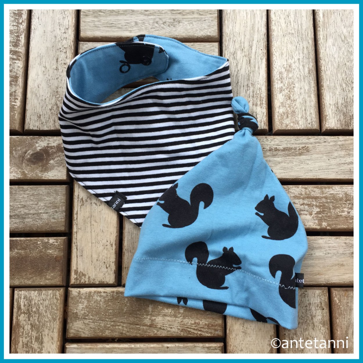 Nach dem Hängerchen und den beiden Raglantuniken waren noch immer Reste der Reste des niedlichen Jerseys mit den Eichhörnchen da. Daraus habe ich eine Knotenmütze samt Wendehalstuch für Baby L. genäht. Beides aus dem Buch Kinderleicht! (siehe oben), die Mütze ist in Größe in Größe 37 – 39, das Halstuch in Einheitsgröße.*