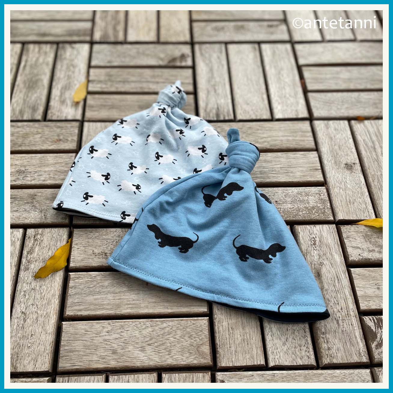 Außerdem brauchte Baby L. Nachschub an Mützen. Am Feiertag Anfang November entstanden nach dem oben bereits erwähnten Schnitt Knotenmütze nochmals zwei Mützen, jetzt bereits in Größe 47 – 49 cm. Diese hier sind doppellagig zum Wenden genäht, auch wenn das mit dem Knoten dann ein bisschen ein Gefummele ist. Wie die Schäfchenmützen gewendet aussieht, kannst du im Beitrag zum passend dazu genähten Halstuch sehen…