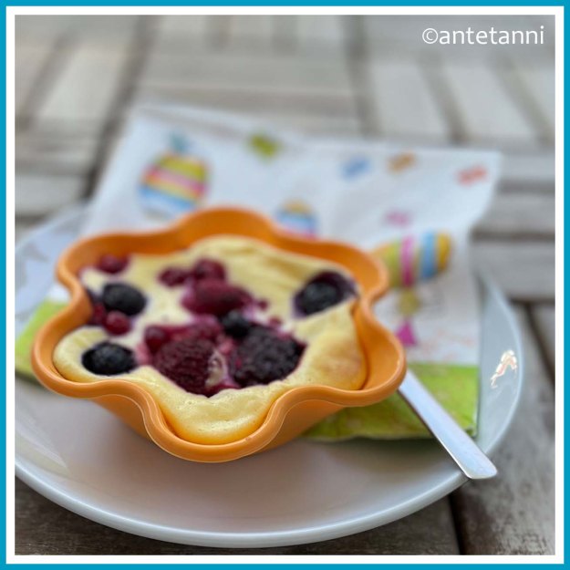 - Währenddessen Quark, Sahne, Eier, Zucker und Vanillepuddingpulver verrühren und in Muffinförmchen füllen – ich habe welche aus Silikon verwendet, die Menge reichte für 8 Förmchen (je ca. 2 EL Masse pro Förmchen)