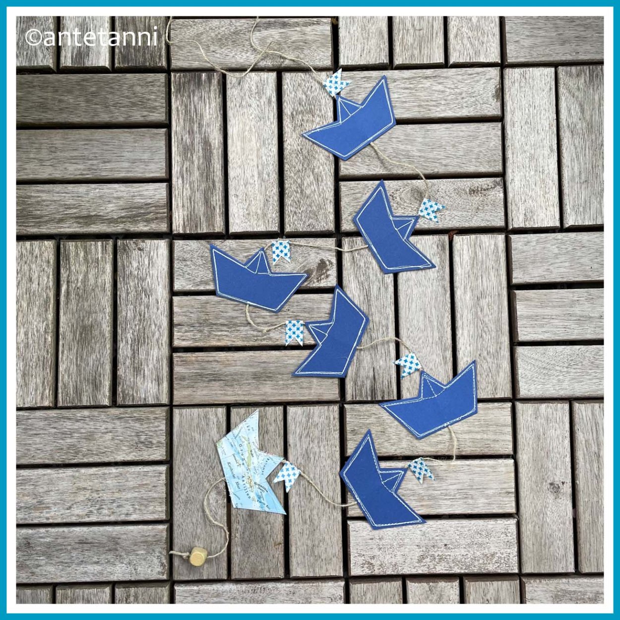 Ich wollte und habe – passend zum maritimen Thema – eine maritime Deko, nämlich eine sommerliche Girlande aus Papierbooten genäht. Die Boote sind aus blauem Tonpapier zusammengenäht, für eines habe ich aus einem alten Atlas ein Boot mit maritimem Hintergrund ausgeschnitten. ♥ Die Girlande macht sich gut am Fenster oder der Terrassentür und weckt vielleicht Erinnerungen an vergangene Reisen oder macht Lust auf neue Planungen (ich hätte die Girlande gerne hängend fotografiert, aber die Fenster waren bis gestern nach viel Saharastaub und nach dem Urlaub noch ungeputzt, glaube mir, das wäre nichts geworden, den Anblick habe ich dir lieber erspart…).