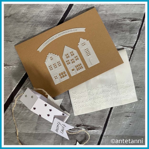 Versendet habe ich die Häuschen in einer Klappkarte, deren Vorderseite ich mit einer Häuserzeile und einem weihnachtlichen Wunsch – ebenfalls ausgestanzt aus Tetrapak – verziert habe. Hach, ich liebe dieses silberfarbene und quasi kostenlose Bastelmaterial.
