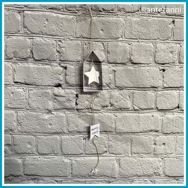 24 Häuschen zum Aufhängen. Sie sind – ohne Kordel – 8 cm hoch und 4,5 cm breit. Sie bestehen aus einem Streifen aus festerem Papier, durch den ich eine Paketschnur gezogen habe, an der ich wiederum zwei Sterne (mit der Stanzmaschine aus Tetrapak gestanzt) und einen Wimpel aus Papier angebracht habe. Auf den Wimpel habe ich beidseitig noch weihnachtliche Grüße in Deutsch und Englisch gelettert. Mittels Klebestreifen am Boden wird der Papierstreifen in (Haus-)Form gebracht und zusammengeklebt. Für den Postversand habe ich die Häuschen an der Unterseite offen gelassen, so lassen sie sich flach zusammenlegen und es bleibt für die Empfängerinnen auch noch ein kleines DIY übrig. Aber eines, das für alle zu schaffen ist, da bin ich sicher. Wenn nicht, gibt’s hier die…