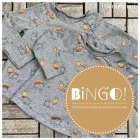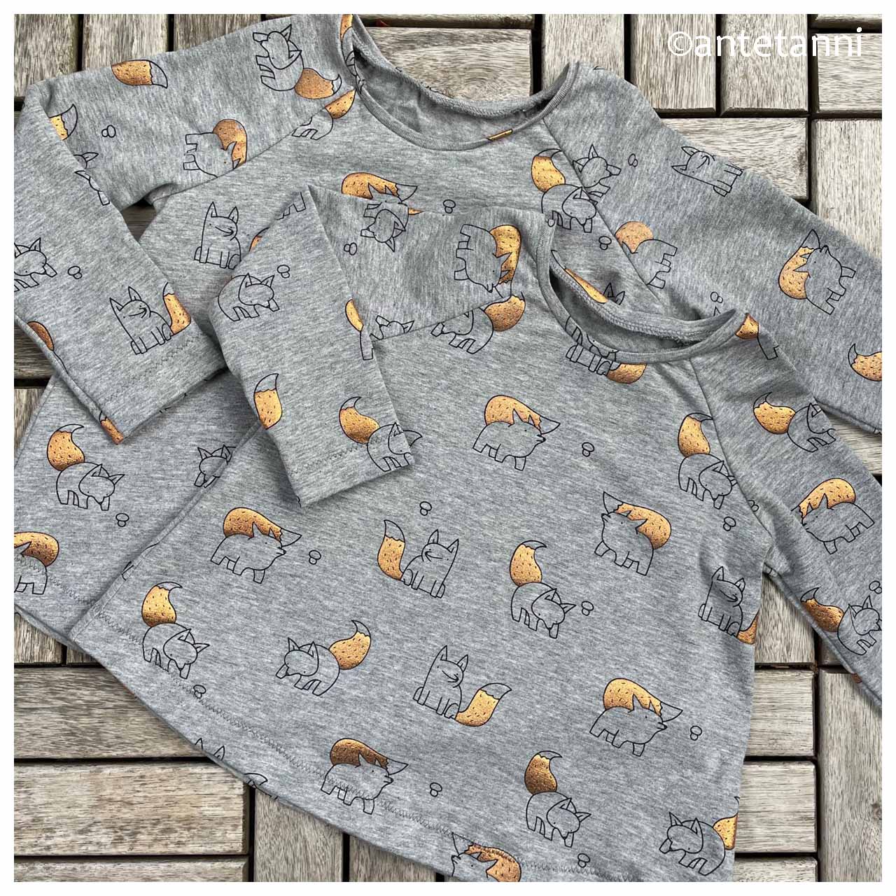 Wie gut, dass ich gewartet habe, denn inzwischen passt der Jersey in Hellgrau, den ich für dieses Nähwerk neu bei Buttinette gekauft habe, viel besser zum Wetter. Sind die Füchse nicht niedlich? Diese sind jeweils noch mit einem einem schimmernden Foliendruck in Kupfer verziert. Knuffig.