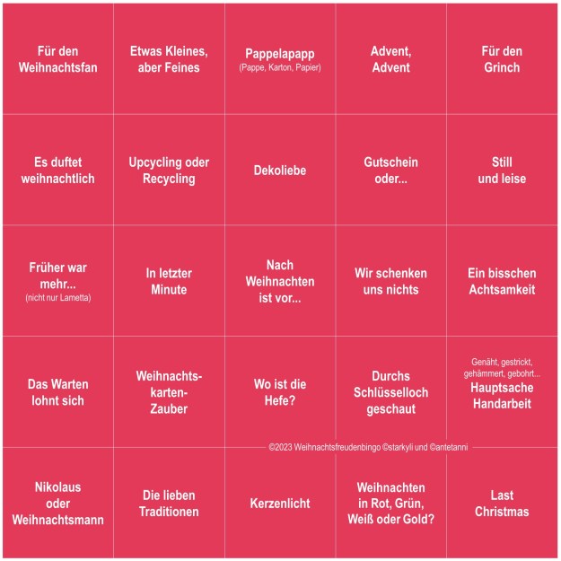Alles klar soweit? Bei Fragen fragen. Wir sind sehr gespannt, was ihr zaubert, und wie viele Bingo-Rufe bei den Weihnachtsfreuden 2023 erklingen werden.