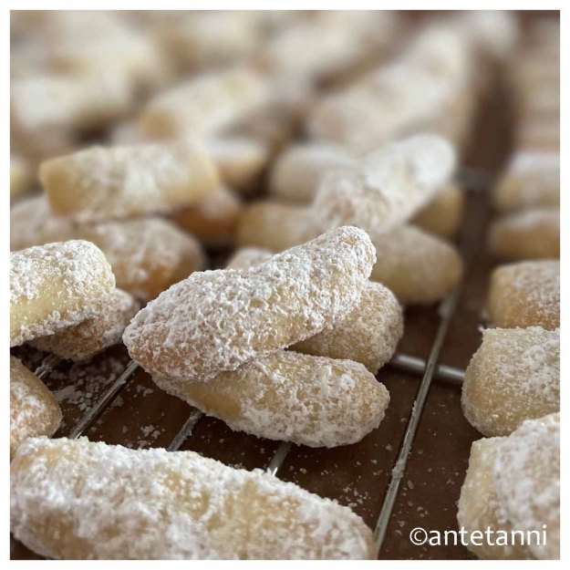 Motiviert hat mich aber auch der Beitrag im Rewe-Magazin 06/2023 Frohe Weihnachten [unten verlinkt], denn die Idee, Vanillestangen zu schneiden, anstelle mühevoll Kipferl zu formen hat mich beim Durchlesen sofort angesprungen. Abweichend vom Magazin aber habe ich die Zutaten für das über Jahrzehnte bewährte Rezept von Edeltraud* gekauft und heute Vormittag endlich gebacken.
