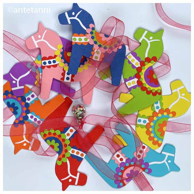 Jedes Dalapferd besteht aus 25, teils minikleinen Papierteilen, die auf- und übereinander geklebt wurden. Was für eine Frickelei, aber es hat mir großen Spaß gemacht, die Farben zu kombinieren und ich mag die bunten Pferde sehr.