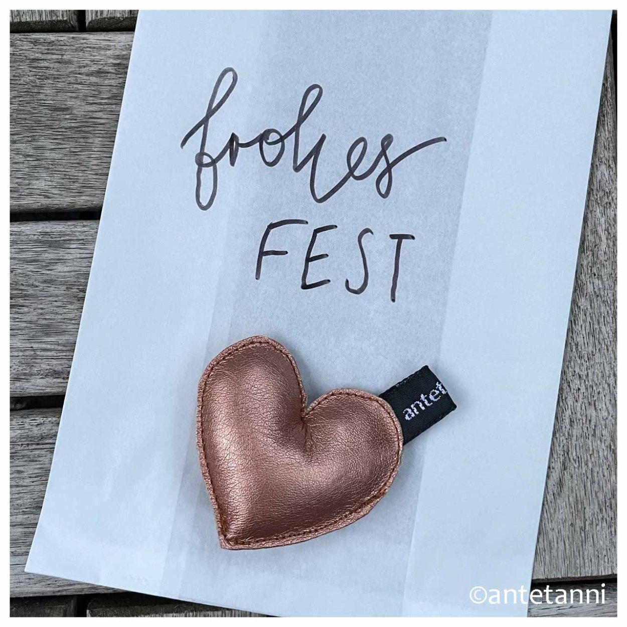 Vielleicht auch als Anhänger an einem Taschengriff oder einfach so zur Deko… Vor ein paar Tagen hatte ich noch schnell ein kleines Herz aus einem Reststück kupferfarbenem Kunstleder genäht, mit Füllwatte ausgestopft und ein antetanni-Label als Schlaufe angenäht.