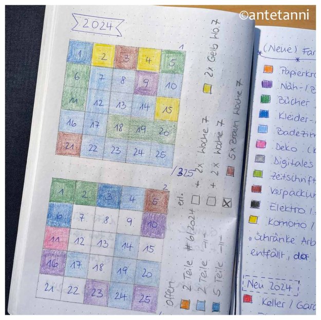 Ich hänge ein wenig hinterher mit dem Ausmalen, denn in Woche 7 habe ich viel Kleinzeugs ausgemistet, die kleinen Zahlenfelder waren aber bereits aufgebraucht. Mal gucken, wie ich das im März gelöst bekomme. Mir wird was einfallen, da bin ich sicher. Woche 8 und 9 kann ich keine Ausmisterfolge vermelden. Ich habe hier und da Zeugs aussortiert, aber nicht notiert, es war zu viel sonst im Leben 1.0 los.