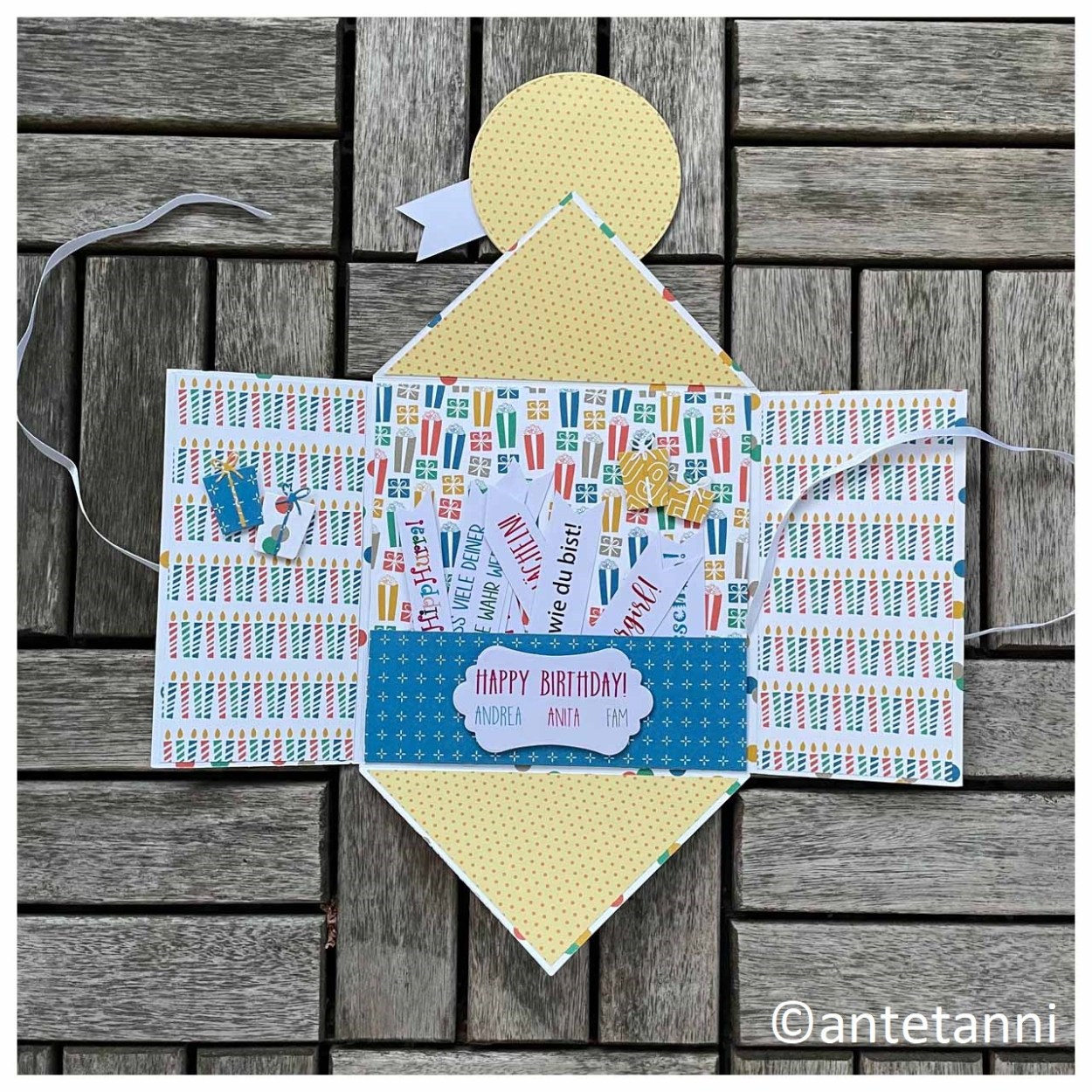 Nach Belieben kann nun Tüddel aller Art auf den Laschen innen und außen angebracht werden. Für eine der Laschen außen kam erneut die Stanze von Alexandra Renke zum Einsatz, die ich sehr gerne mag, auch wenn das Aufkleben des ultradünnen Schriftzuges „zum Geburtstag“ immer ein wenig friemlig ist. Innen habe ich über die gesamte Breite eine Lasche zum Einstecken von Wünschen und Sprüchen (hier könnte man auch einen Gutschein, Fotos oder Geld reinlegen) angebracht, die ich zuvor in Word erstellt und auf dem Farbdrucker ausgedruckt habe. Außerdem habe ich mit 3D-Abstandspads noch Geschenke, ein Herz und unseren Geburtstagsgruß aufgeklebt.