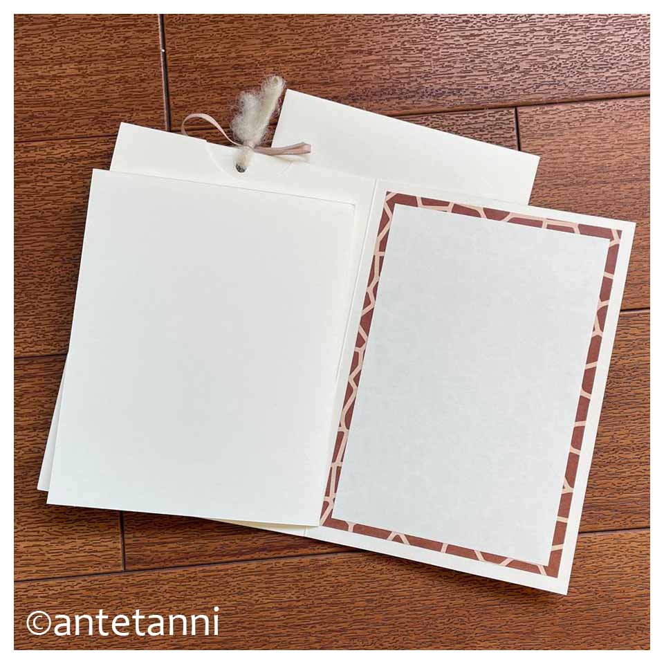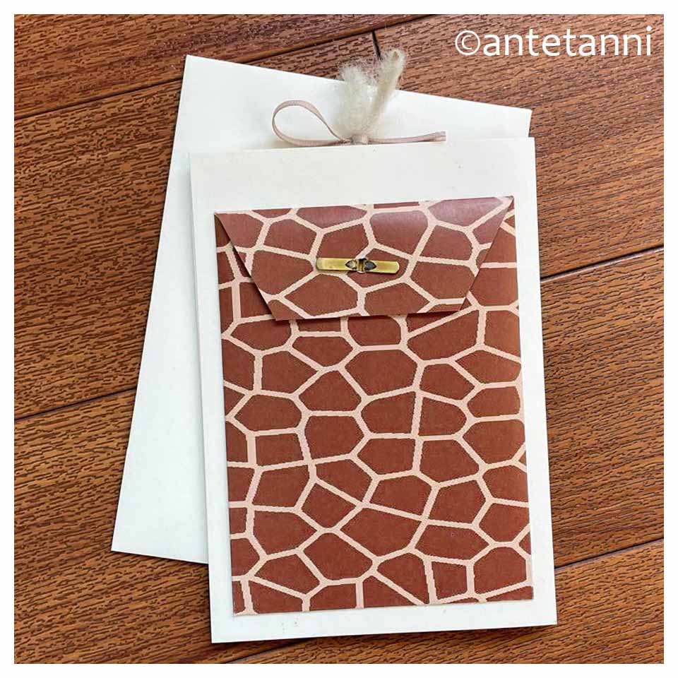 Die Hochzeitskarte besteht aus einem zur Klappkarte gefalzten Bogen Papier. Wenn man oben in der Mitte am Band zieht, stellt sich ein Teil der Vorderseite (Motiv Giraffenfell) auf und darunter kommt der Spruch der Überschrift zum Vorschein. Auf dem Kartenstück, das ausgezogen wird, habe ich in ein Herz (du kannst das im Bild unten rechts unter dem Band gerade so erahnen) die Namen der beiden Frischvermählten geschrieben.