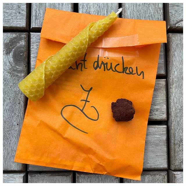 - Das Tütchen an Tag 7 war geheimnisvoll mit „Nicht drücken“ beschriftet. Vorsichtig ausgepackt, kamen eine Bienenwachskerze und einen Räucherkegel zum Vorschein. Wie spannend, was man alles selber machen kann! Vielen Dank, Bine. Für den Kegel muss ich noch eine feuerfeste Unterlage suchen und bin schon sehr gespannt auf das „Raucherlebnis“. 🙂