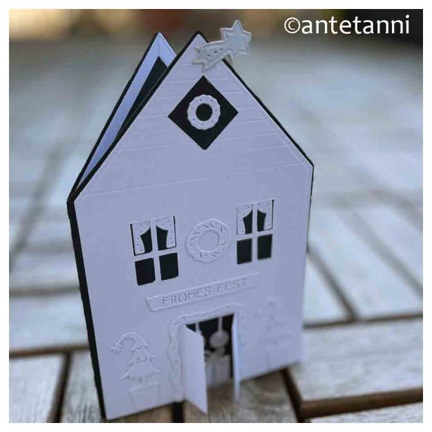 Hach, der Weihnachtskarten-Bloghop 2024 hat mich wieder inspiriert, mich an neue Papierbasteleien zu setzen. Das Innenleben des Hauses und die Verzierungen (Bäumchen, Kränze, Spruch über der Tür) sind aus der extra für den Bloghop gekauften Stanzschablone ausgestanzt, die Fenster und die Eingangstür habe ich mit dem Cutter aus weißem Kraftpapier ausgeschnitten und die „Holzbretter-Optik“ mit dem Falzbrett gefalzt. Immer wieder greife ich bei meinen Basteleien zu Tetrapaks und so sind auch hier kleine Zierelemente aus dem Milchtütenupcycling entstanden. Die Karte selbst, die ich passend zur Haus-Innenseite ausgeschnitten habe, sowie das Lichthaus sind ebenfalls aus weißem und schwarzen Kraftpapier. Für meinen Grußtext habe ich einen dazu passenden Einleger ausgeschnitten, da ich nicht so gerne mit diesen Gelstiften schreibe, da diese, kaum geöffnet, nach dem dritten oder vierten Wort schon ihren Geist aufgeben. Seufz. 😉